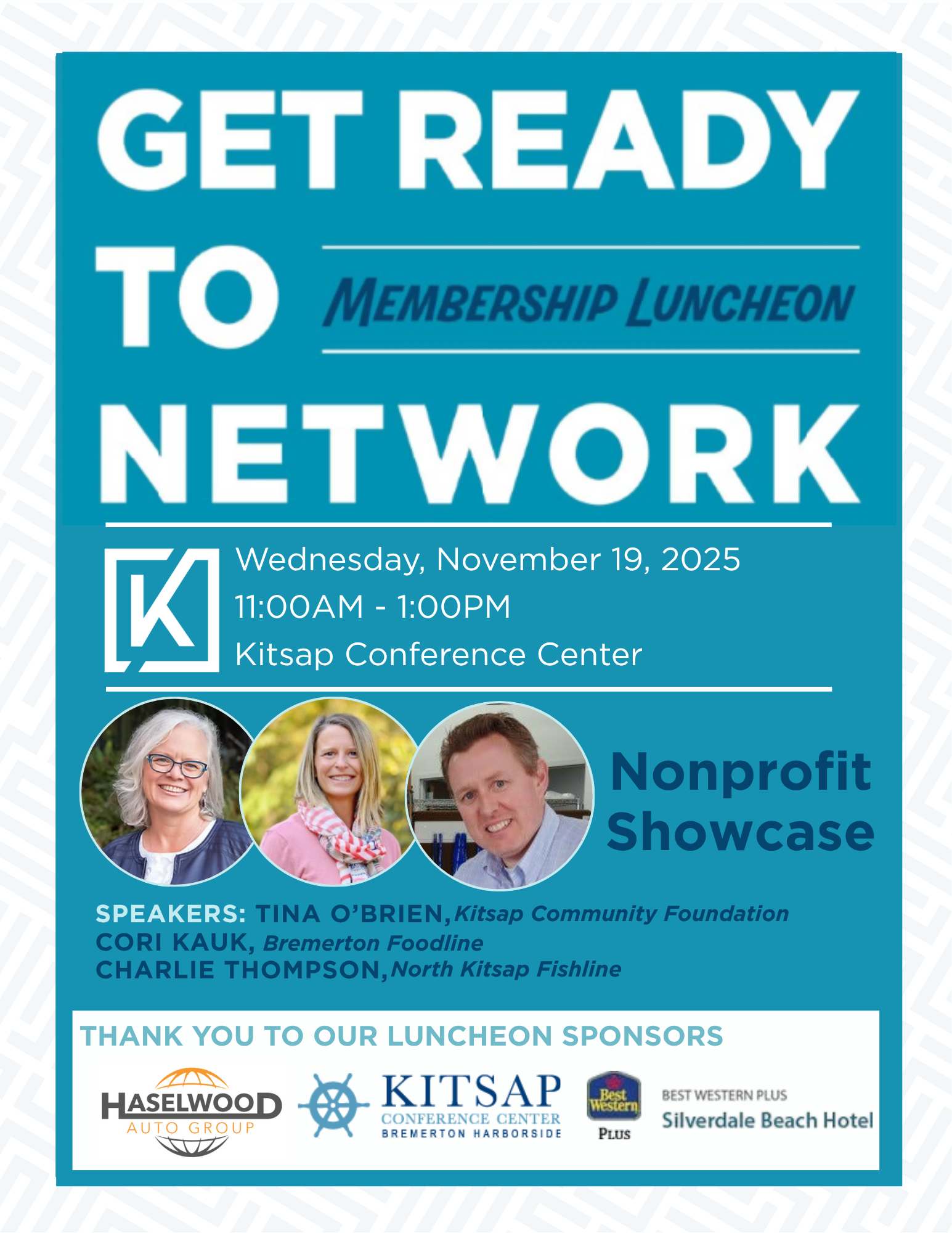 Join us for the Greater Kitsap Chamber’s monthly luncheon—a cornerstone event for building connections and staying informed. Each month, members and guests come together to network, share ideas, and hear from engaging speakers on topics that matter to our business community, including networking strategies. This November, we’re excited to welcome Tina O'Brien (Kitsap Community Foundation), …