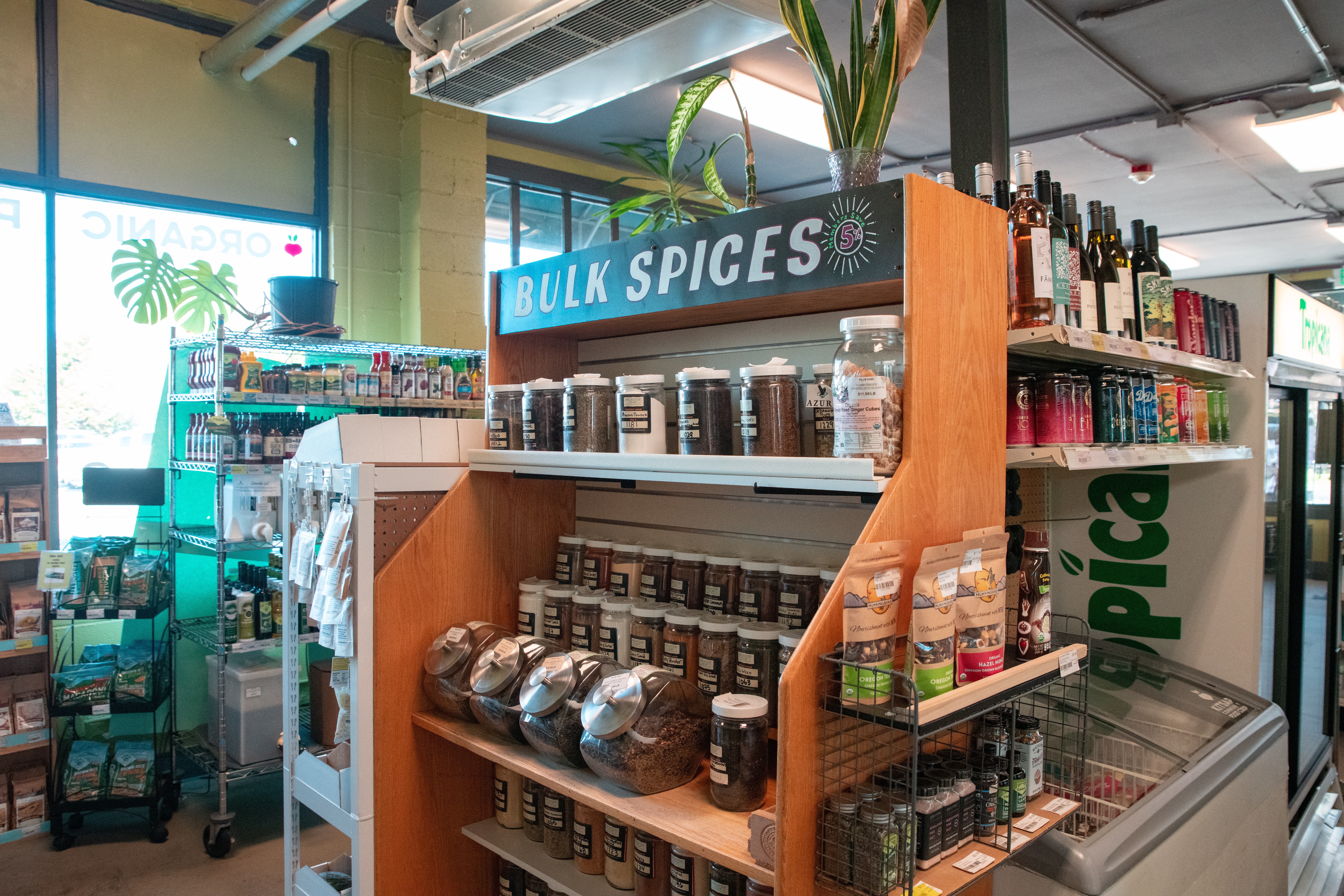 A robust bulk section reduces packaging waste and allows customers to purchase only what they need. Shoppers are encouraged to bring their own containers.