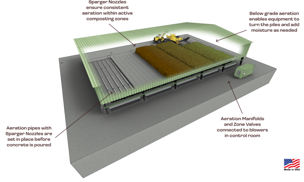 Airflow is controlled beneath compost piles, maintaining oxygen levels and temperatures that encourage beneficial microbes while minimizing odors and methane emissions. Sensors, blowers and monitoring systems help operators manage the biological process with precision.