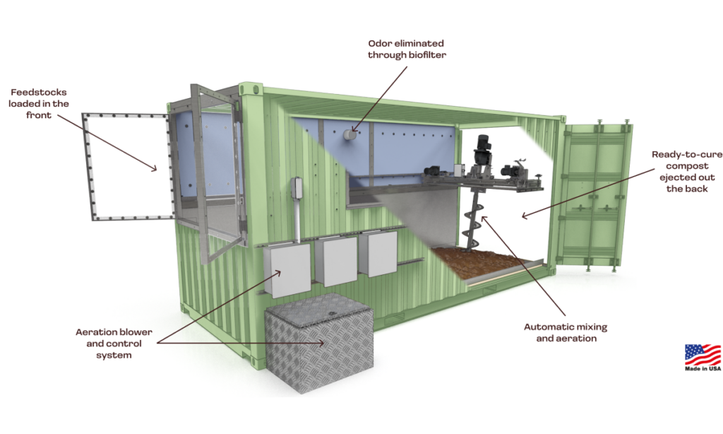 To help bridge that gap, GMT developed Earth Flow, a retrofitted shipping container system that functions as a self-contained composting vessel with built-in aeration and leachate capture.